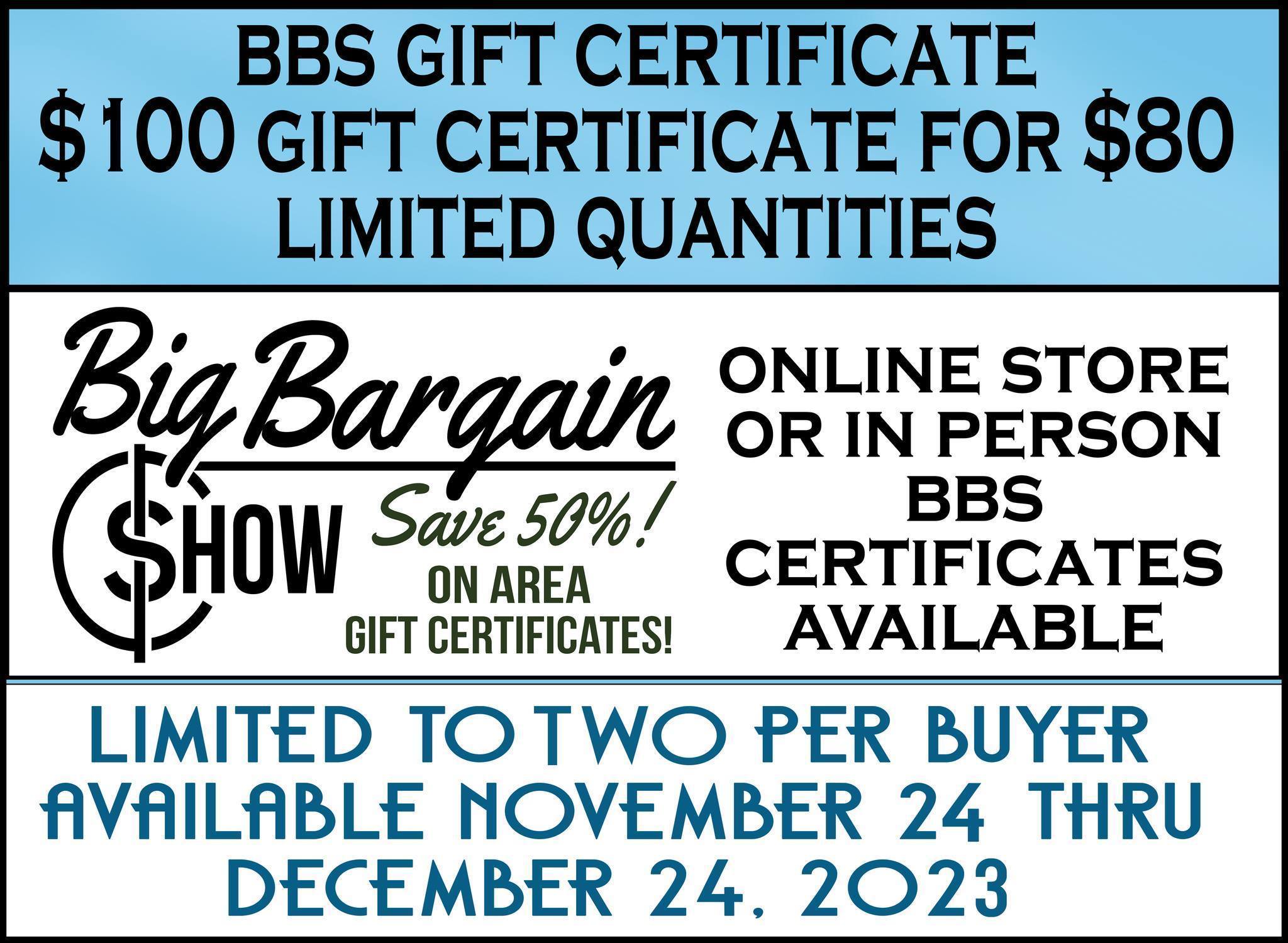95.9 KISS fm - WKUZ - Big Bargain Show. Choose from paper or online store - limit 2 per family - valid till December 31, 2026 - value: $100